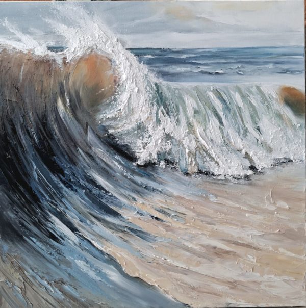 La palette chromatique, subtilement orchestrée, mêle des bleus profonds aux nuances minérales de gris argenté, relevés de beiges sablés évoquant la rencontre entre l’écume et le rivage. Ces contrastes créent une vibration lumineuse qui renforce la sensation de mouvement. Une lumière diffuse, presque nacrée, enveloppe la scène et adoucit la puissance de la vague, conférant à l’ensemble une atmosphère élégante et apaisante.