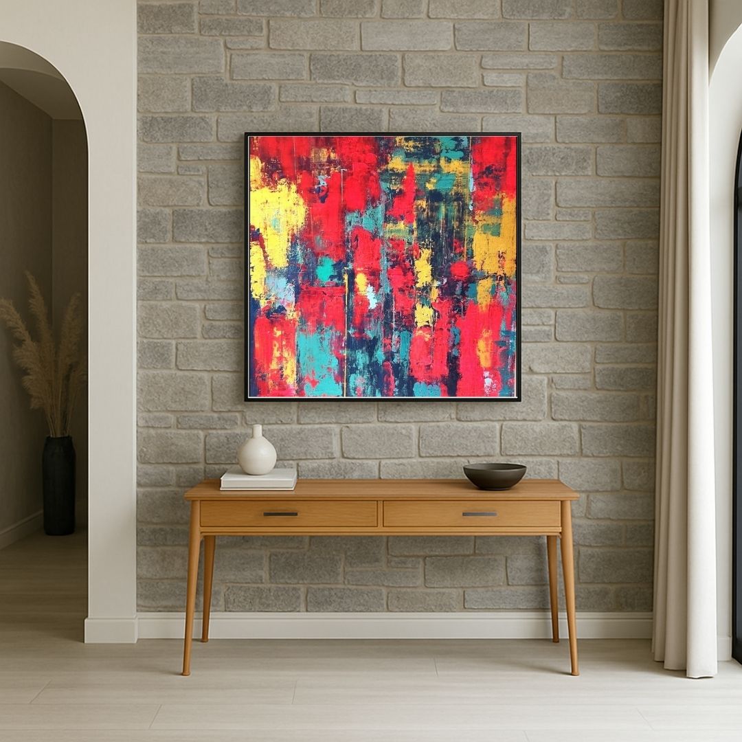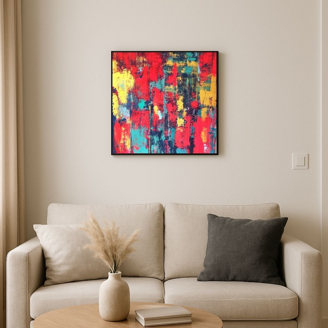 La palette chromatique, dominée par des rouges profonds, des jaunes lumineux et des touches de turquoise, crée une tension visuelle forte, à la fois énergique et structurante. Les couches de peinture, les frottements et les contrastes suggèrent une construction progressive, comme un ensemble d’éléments distincts formant une unité cohérente.