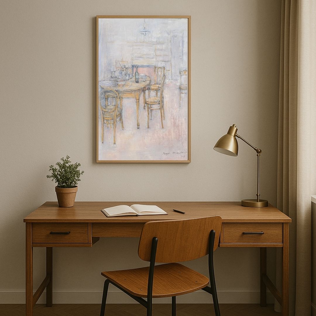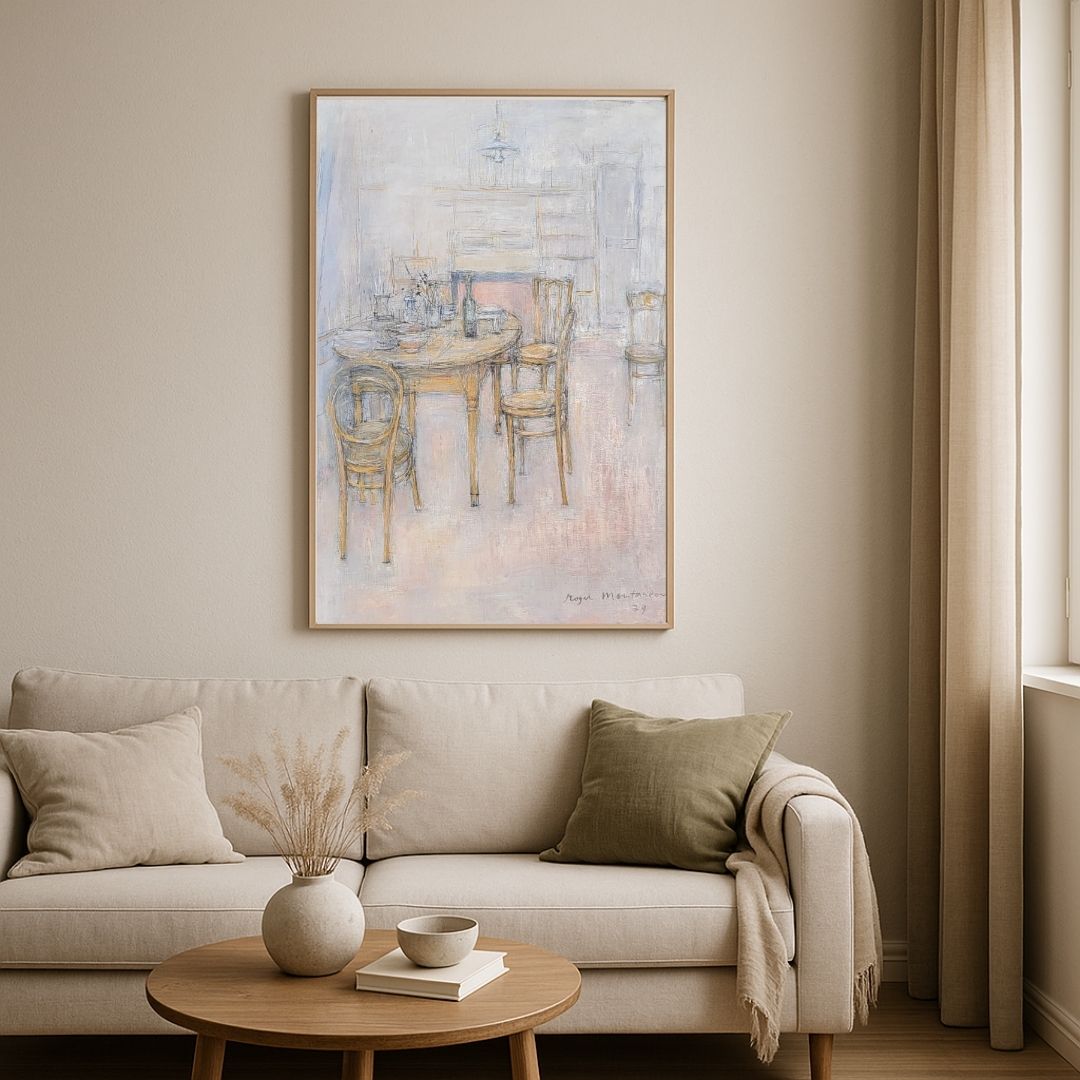 Cette œuvre représente un intérieur de café ou de salle à manger, structuré autour de tables et de chaises de bistrot. Le traitement volontairement esquissé des formes, associé à une palette lumineuse et feutrée, confère à la scène une impression de calme suspendu. Réalisée en 1979, elle appartient à la période de maturité de l’artiste et illustre pleinement son style caractéristique.
