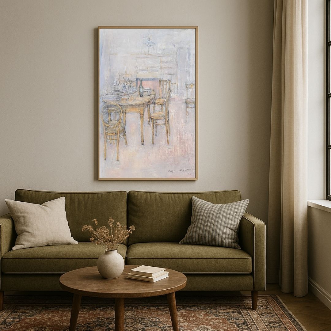 Roger Montandon (1918–2005) war ein Schweizer Maler, der vor allem für seine stillen und poetischen Innenraumszenen bekannt ist. Seine Werke zeigen häufig vertraute Orte wie Cafés, Speiseräume, Tische und Stühle, meist ohne menschliche Figuren, wodurch eine zeitlose und kontemplative Stimmung entsteht.