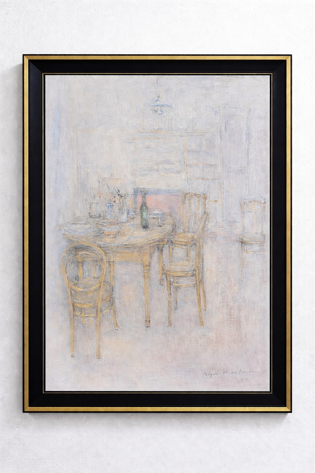 Intérieur au café | Huile sur toile – Roger Montandon (1918–2005) est un peintre suisse reconnu pour ses scènes d’intérieurs empreintes de silence et de poésie. Son œuvre explore des espaces familiers — cafés, salles à manger, tables et chaises — vidés de toute présence humaine, laissant place à une atmosphère méditative et intemporelle https://art-et-culture.ch/categorie-produit/lithographies-et-affiches/.