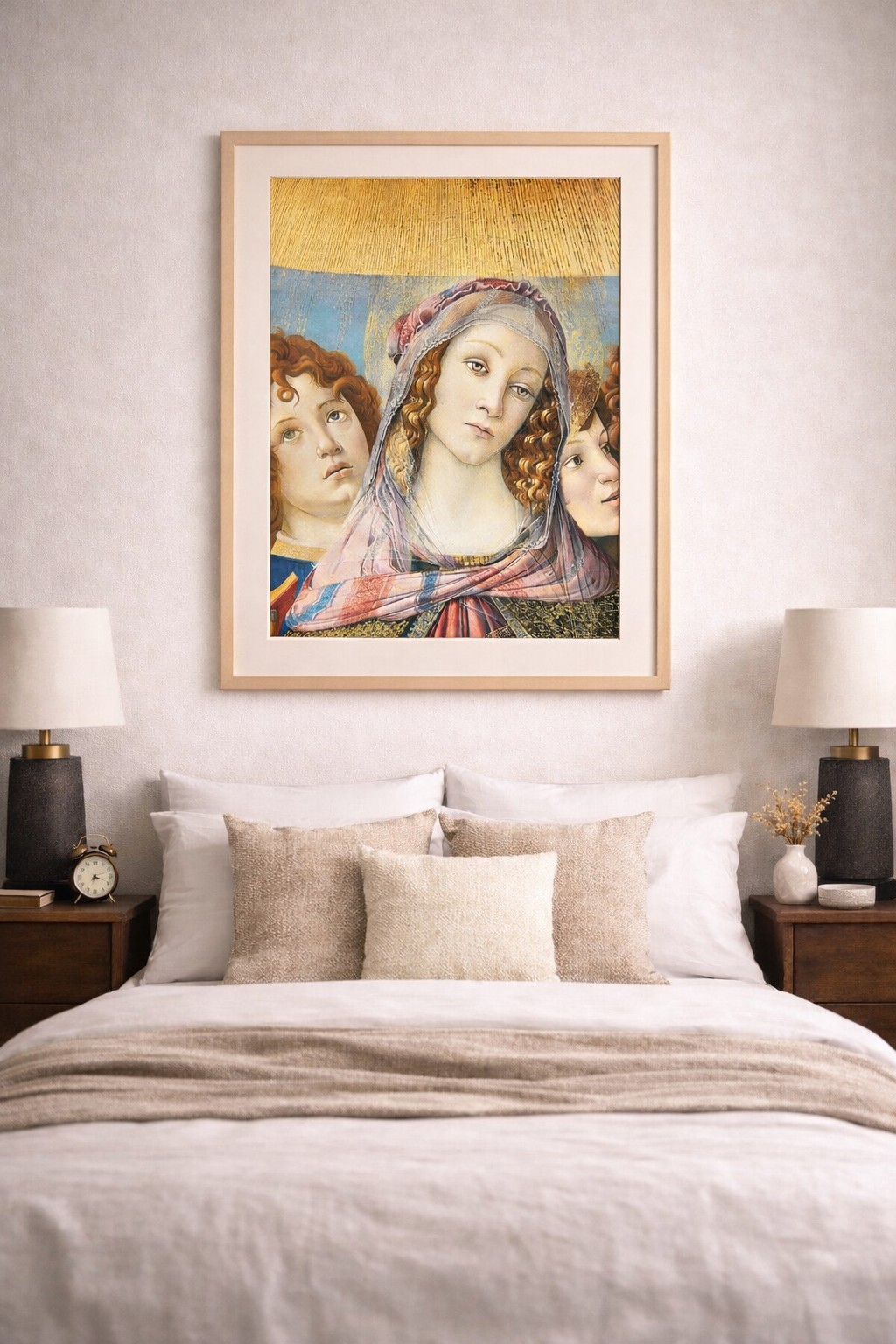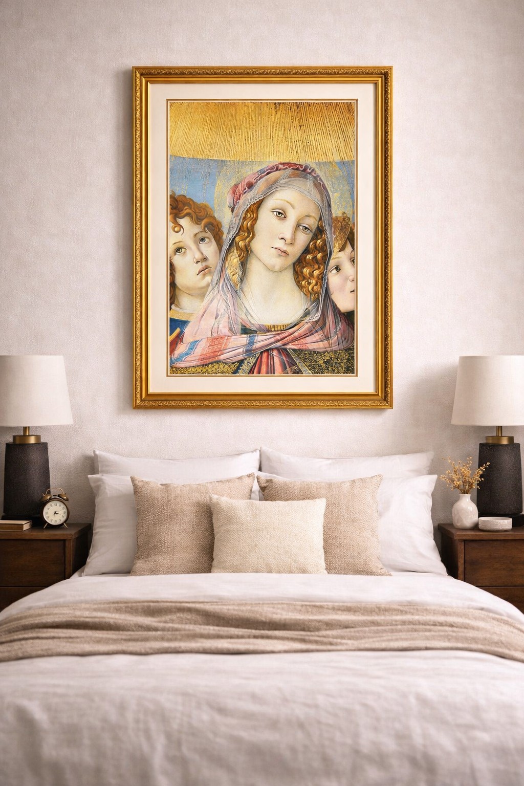 This beautiful fine art print depicts The Virgin and the Angels, a central theme of the Italian Renaissance. Inspired by the work of Sandro Botticelli, it features graceful faces, soft color harmonies, and refined details typical of Florentine art of the 15th century.