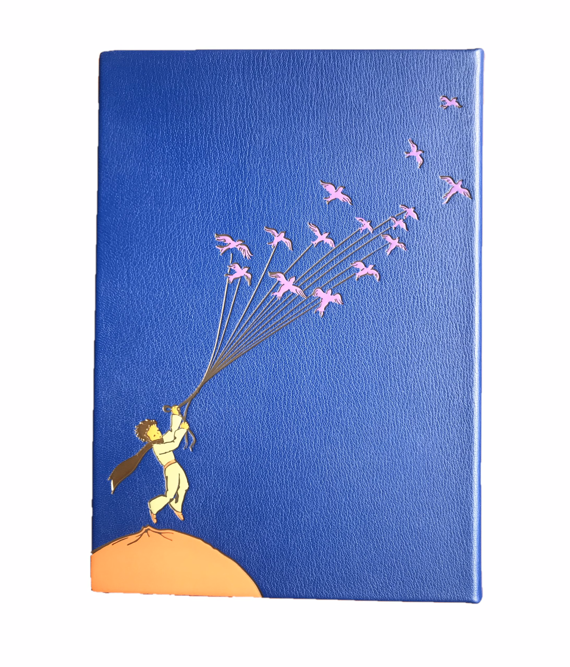 L’illustration originale, minutieusement reproduite sur la reliure, a nécessité l’usage de dix fers à dorer, témoignant d’un savoir-faire artisanal d’une grande finesse. Chaque détail, des étoiles dorées au Petit Prince s’envolant parmi les oiseaux, a été exécuté avec un soin extrême.