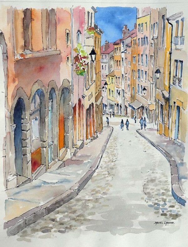 Dieses Aquarell veranschaulicht eindrucksvoll Daniel Lanoux’ Fähigkeit, den historischen Charme der Städte und die Poesie urbaner Augenblicke mit Sensibilität und Eleganz zu vermitteln.
