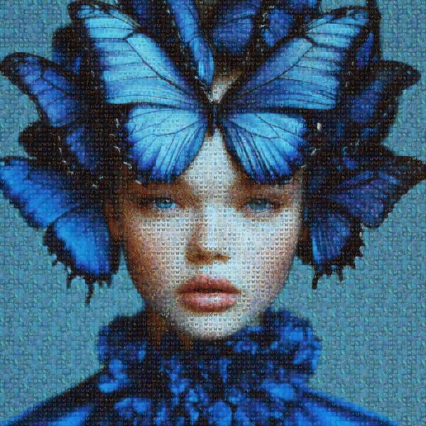 The uniqueness of this piece lies in its mosaic composed of more than 10,000 individual visual tiles. From a distance, the viewer perceives the enigmatic face of a young woman, crowned with a majestic arrangement of blue butterflies — a powerful symbol of metamorphosis and freedom. As one approaches the artwork, the image breaks down into a multitude of micro-fragments, revealing unexpected richness and a diversity of interpretations. This dual perception — both global and intimate — is central to Novarino’s artistic approach, in which the figurative icon is transcended and embedded within a contemporary narrative structure.
