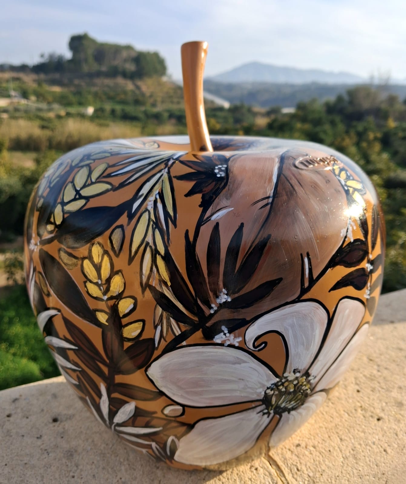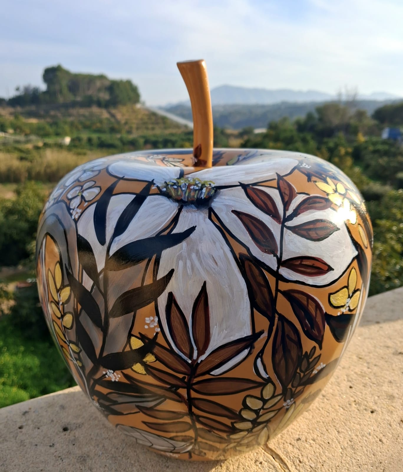 Cette Pomme design Fleurs d’automne sculpturale de 28 cm de diamètre incarne l’univers graphique et solaire de Céline Lust, à travers sa marque LUSTART, créée en 2018. Pensée comme un objet d’art décoratif contemporain, cette pièce associe formes généreuses et motifs géométriques peints à la main, signature visuelle de l’artiste.