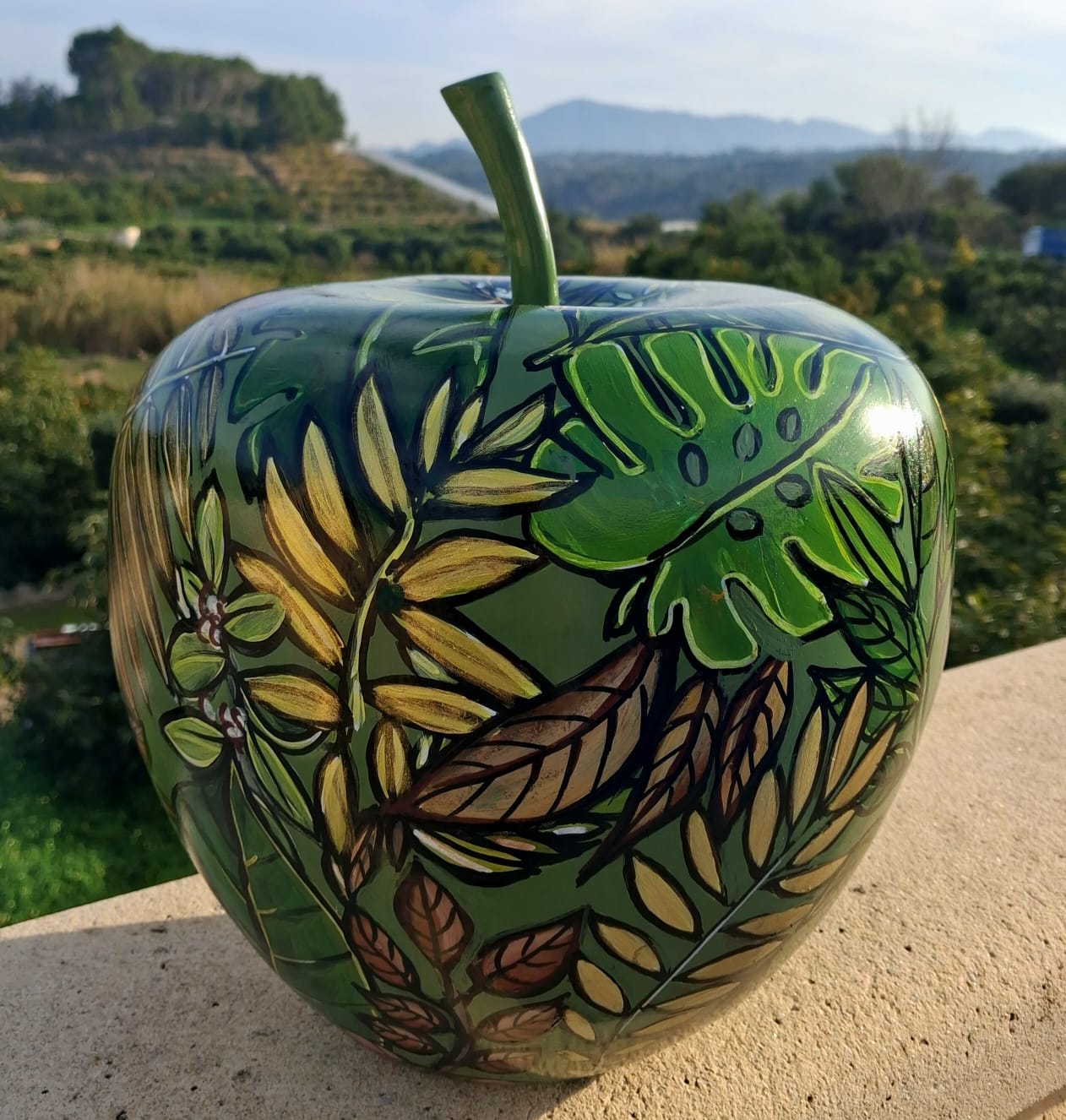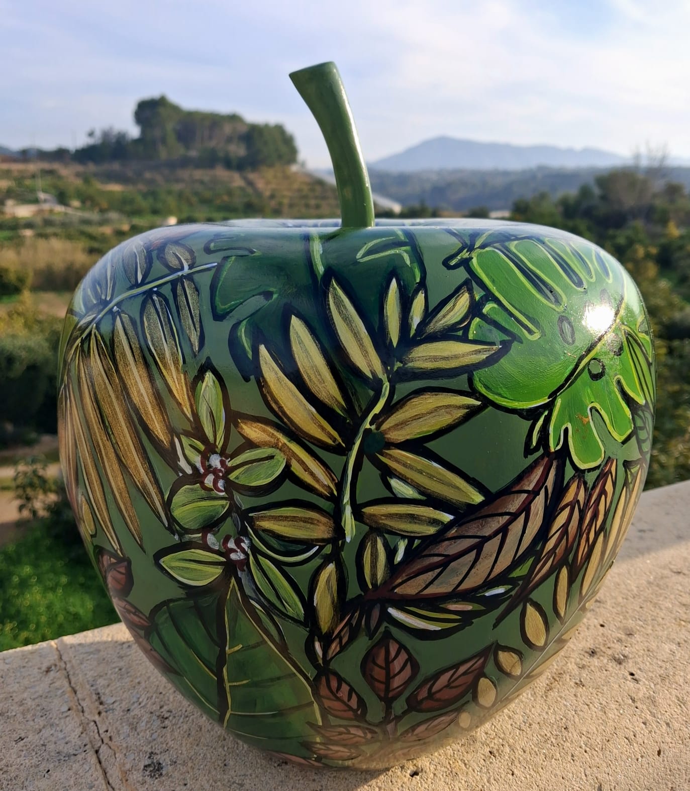 Cette Pomme design – Forêt tropicale Verte sculpturale de 28 cm de diamètre incarne l’univers graphique et solaire de Céline Lust, à travers sa marque LUSTART, créée en 2018. Pensée comme un objet d’art décoratif contemporain, cette pièce associe formes généreuses et motifs géométriques peints à la main, signature visuelle de l’artiste.