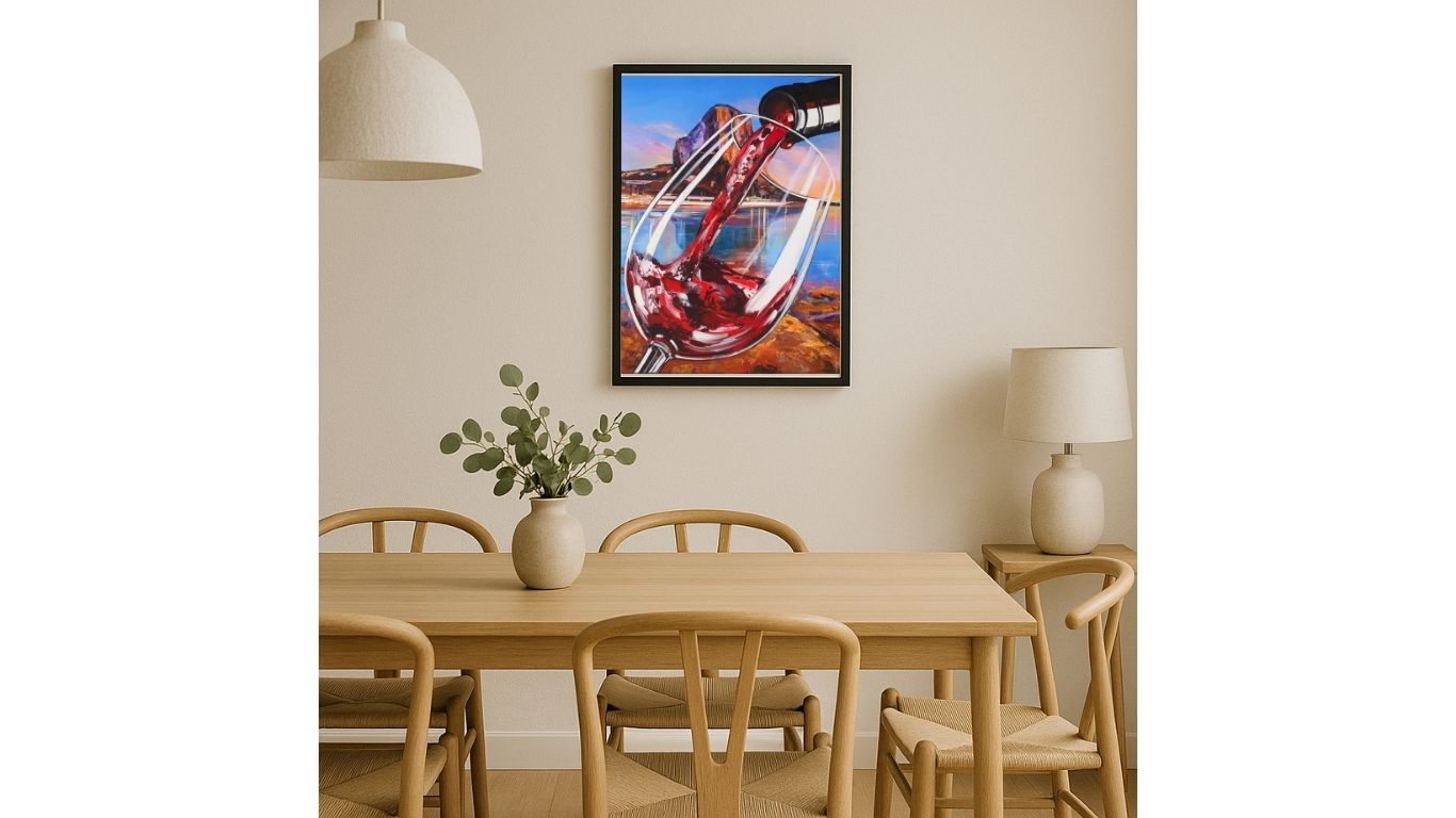 Avec Verre de vin Costa Blanca, Céline Lust célèbre l’art de vivre méditerranéen à travers une composition expressive et résolument contemporaine. L’artiste met en scène un verre de vin rouge en plein mouvement, sa robe profonde et vibrante semblant jaillir de la toile, dans un élan presque chorégraphique.