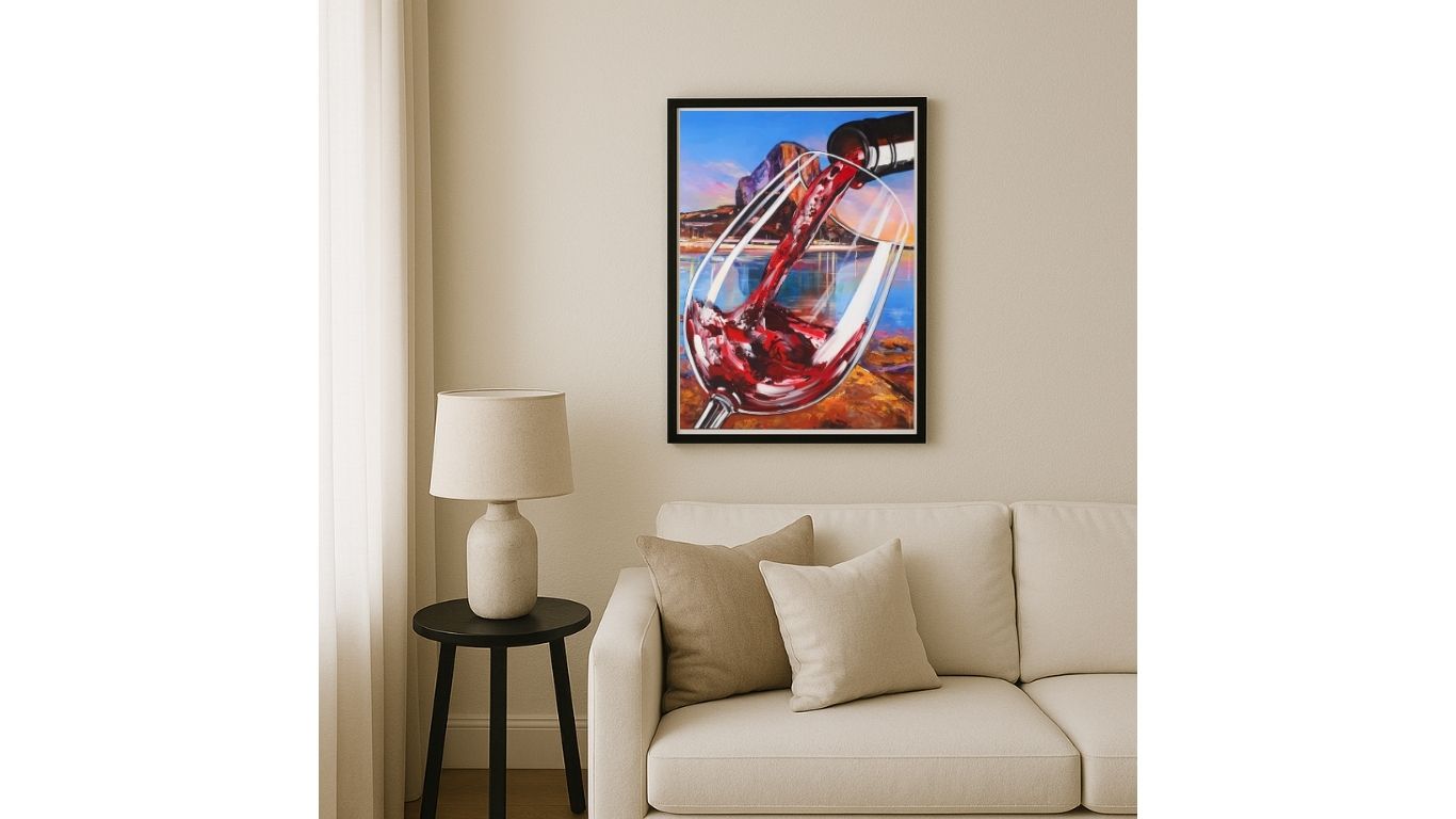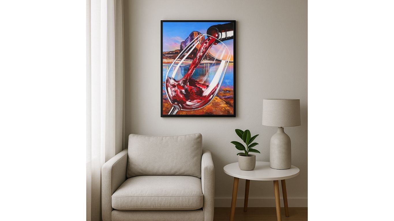 À l’arrière-plan, le paysage de la Costa Blanca se dévoile subtilement : mer calme, reliefs rocheux baignés de lumière, ciel aux nuances pastel. Ce décor lumineux contraste avec l’intensité du rouge du vin, créant une tension visuelle forte entre fraîcheur méditerranéenne et chaleur sensorielle. Le verre, traité avec des lignes amples et dynamiques, devient le véritable sujet de l’œuvre, symbole de partage, de plaisir et de contemplation.