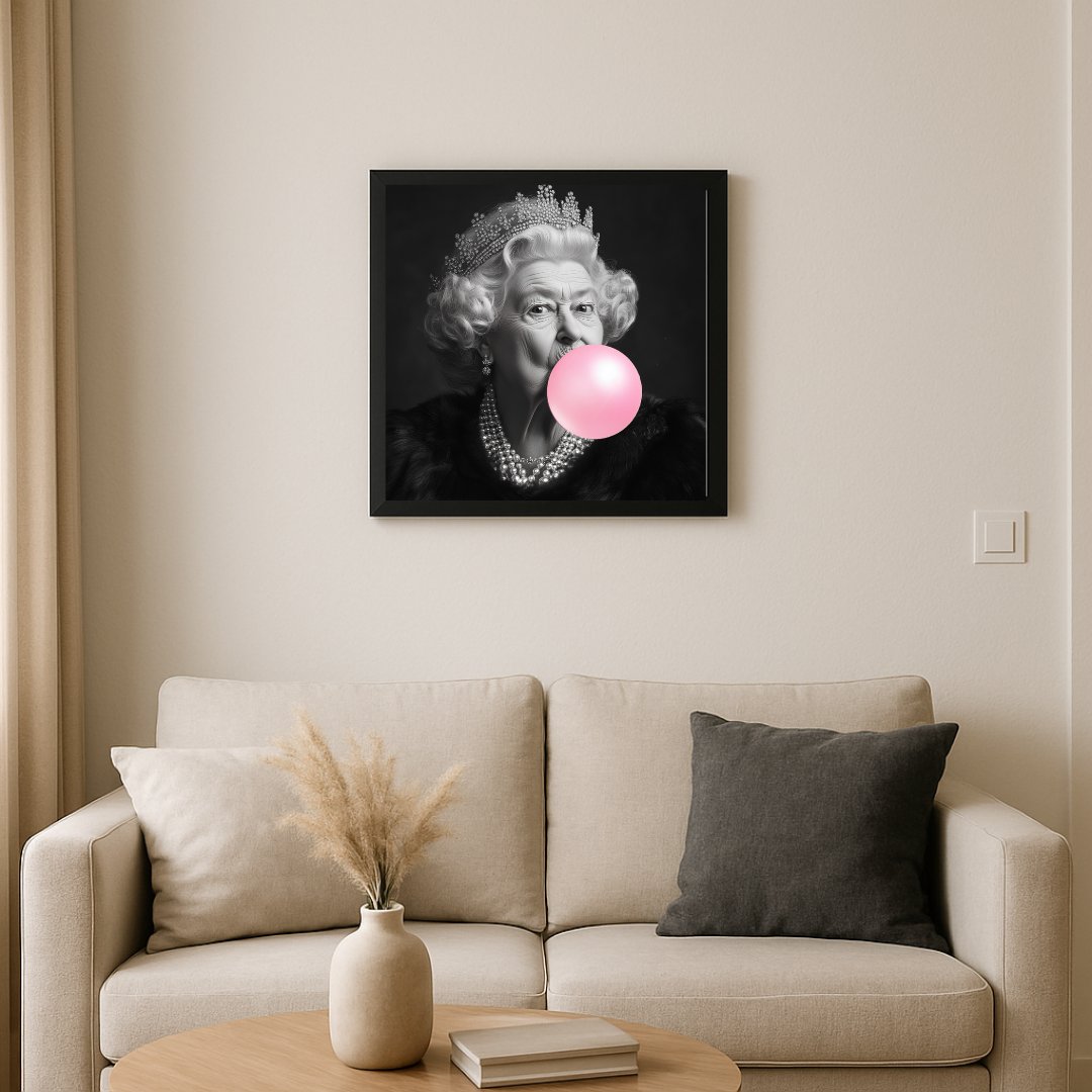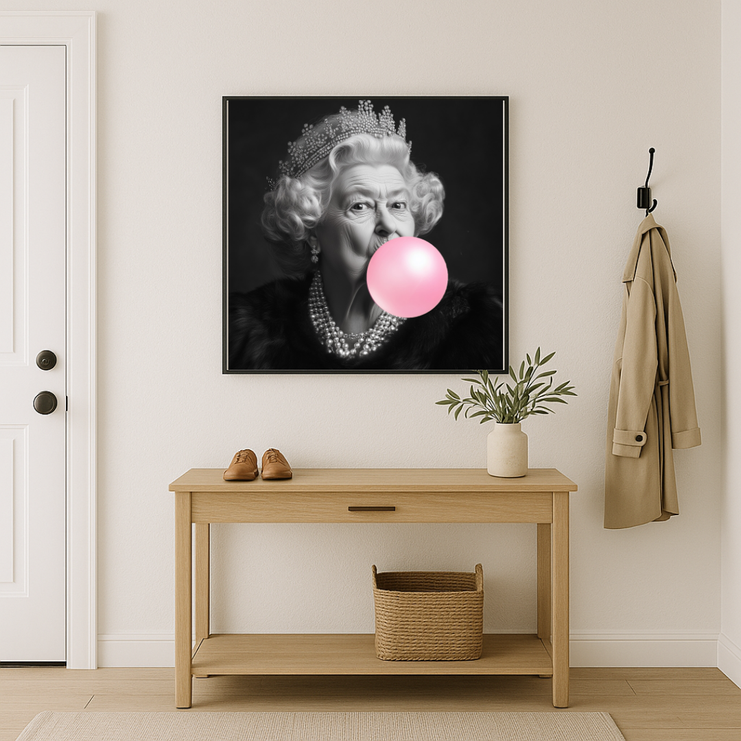 Avec Queen Elisabeth Bubble, Fabien Novarino s’amuse à bousculer les codes de l’art et de l’iconographie officielle. L’artiste détourne ici l’image solennelle et majestueuse d’une figure royale, symbole de dignité et de tradition, en lui ajoutant un détail à la fois incongru et espiègle : une bulle de chewing-gum rose, éclatante et ludique. Ce contraste volontaire crée un effet de surprise, provoquant le spectateur entre respect du mythe et humour irrévérencieux.