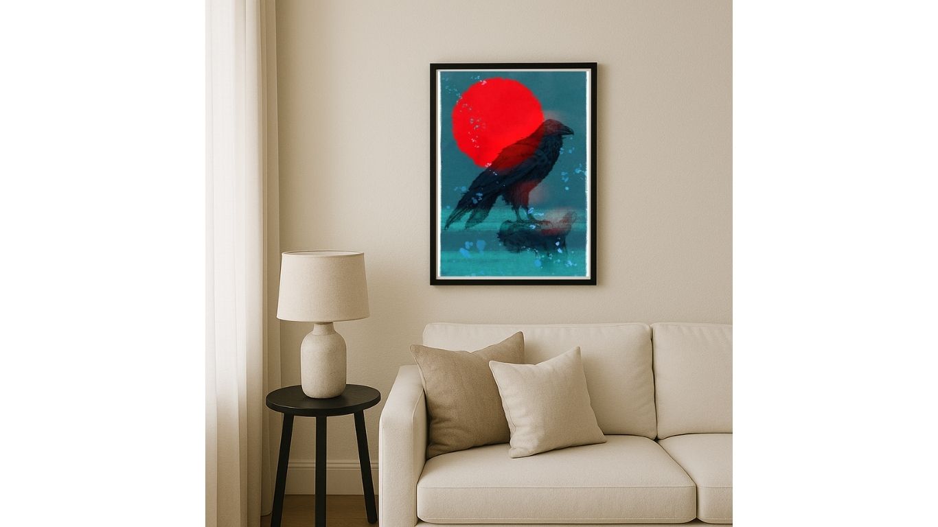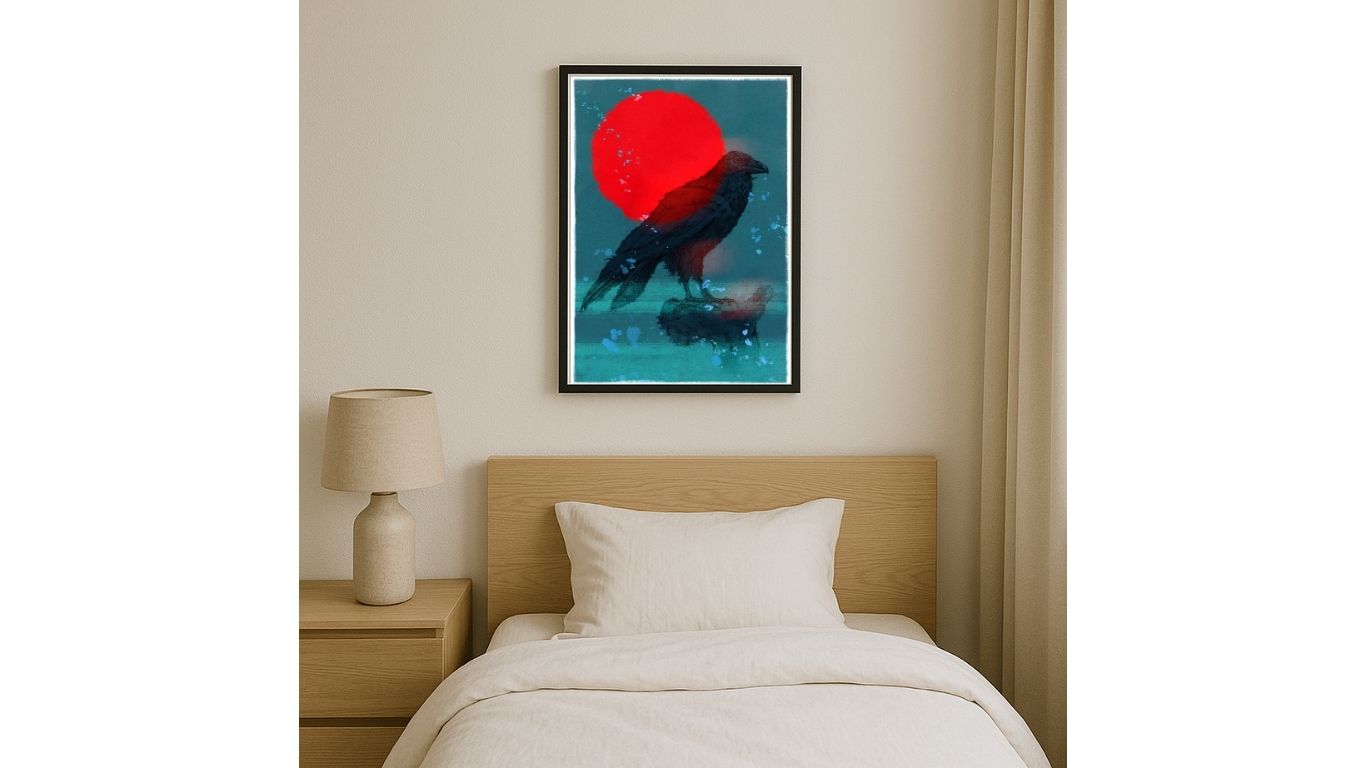 Raven 5 montre un corbeau sombre se découpant devant un soleil rouge incandescent. Entre fusain, pastels et digital, l’artiste crée une atmosphère silencieuse et mystique. L’oiseau, immobile et vigilant, semble garder la frontière entre lumière et obscurité.