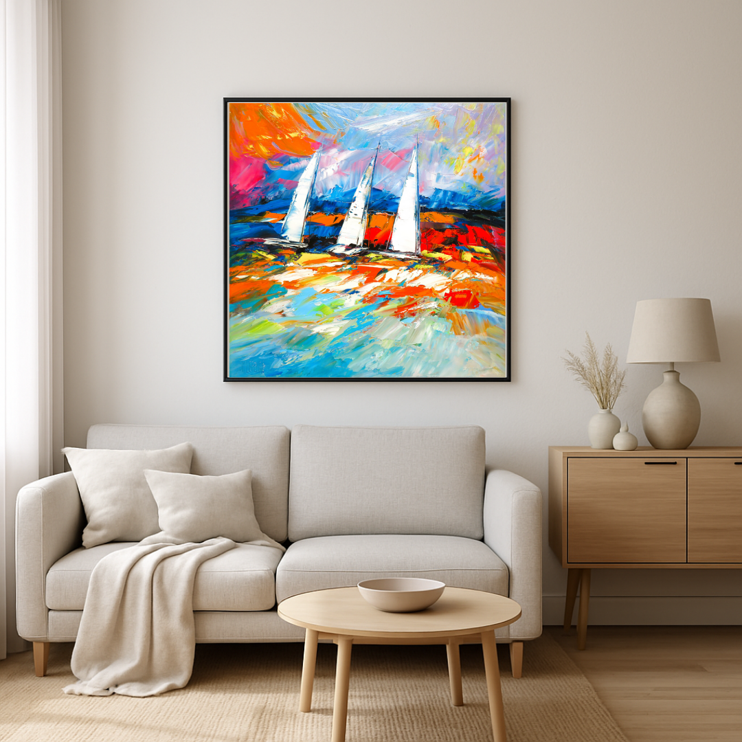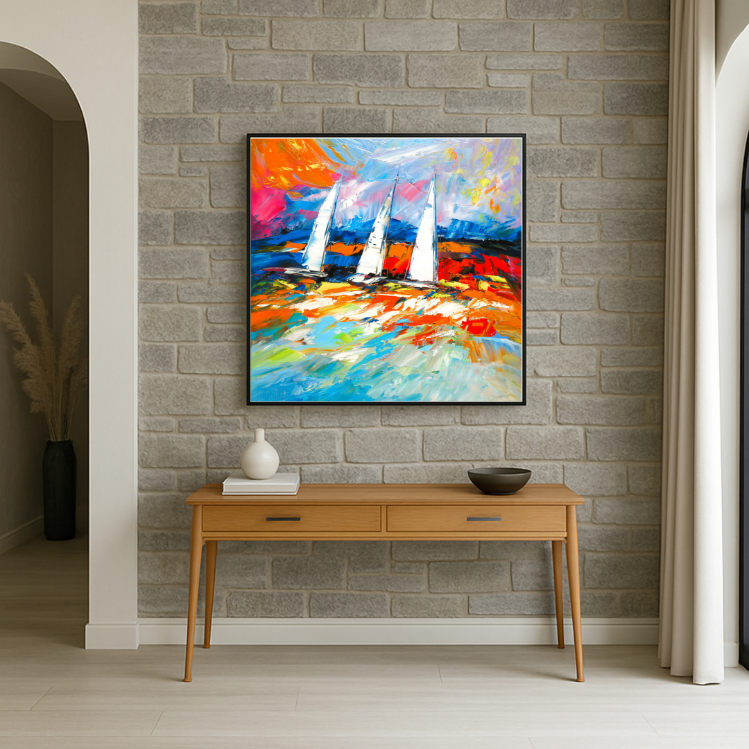La scène n’est pas une simple représentation réaliste, mais une interprétation sensible et libre, où l’abstraction frôle la figuration. Chaque voile semble surgir de la toile, tendue vers un horizon invisible, emportée par l’énergie de la mer et du ciel.