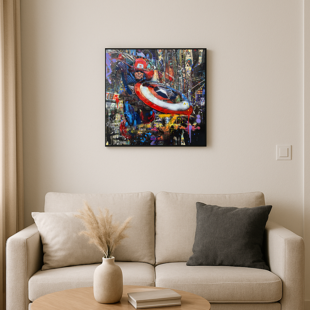 Speed América de Fabien Novarino est une œuvre de street art contemporain, imprimée sur Dibond aluminium puis retouchée à la main en 3D. Captain America surgit en pleine action, bouclier en avant, au cœur d’une ville inspirée de New York, saturée d’affiches, de graffitis et de couleurs éclatantes. Chaque pièce est unique, signée et rehaussée de peinture, éclaboussures et collages.