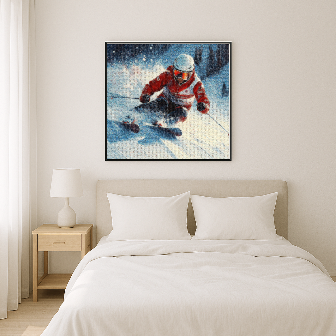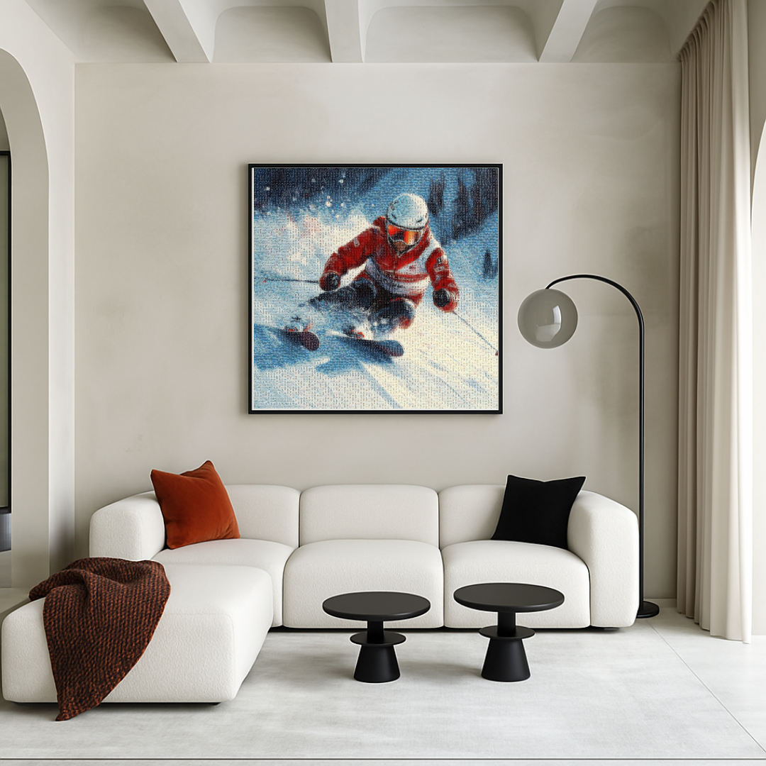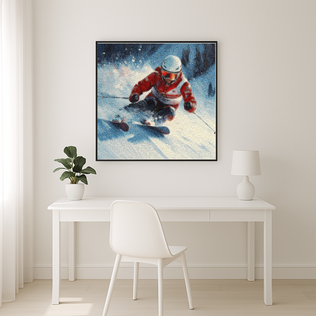 La force de cette création réside dans sa mosaïque de plus de 10 000 vignettes. De loin, le spectateur aperçoit la silhouette d’un skieur lancé à pleine vitesse, concentré et maîtrisant avec précision sa trajectoire sur la neige. Le rouge éclatant de sa combinaison contraste puissamment avec l’intensité du paysage enneigé. En s’approchant, l’image se décompose en une multitude de micro-fragments visuels, qui apportent une profondeur supplémentaire et enrichissent l’expérience de contemplation. Cette double lecture, à la fois globale et minutieuse, incarne parfaitement l’approche artistique de Novarino : fusionner mémoire collective et langage visuel moderne.