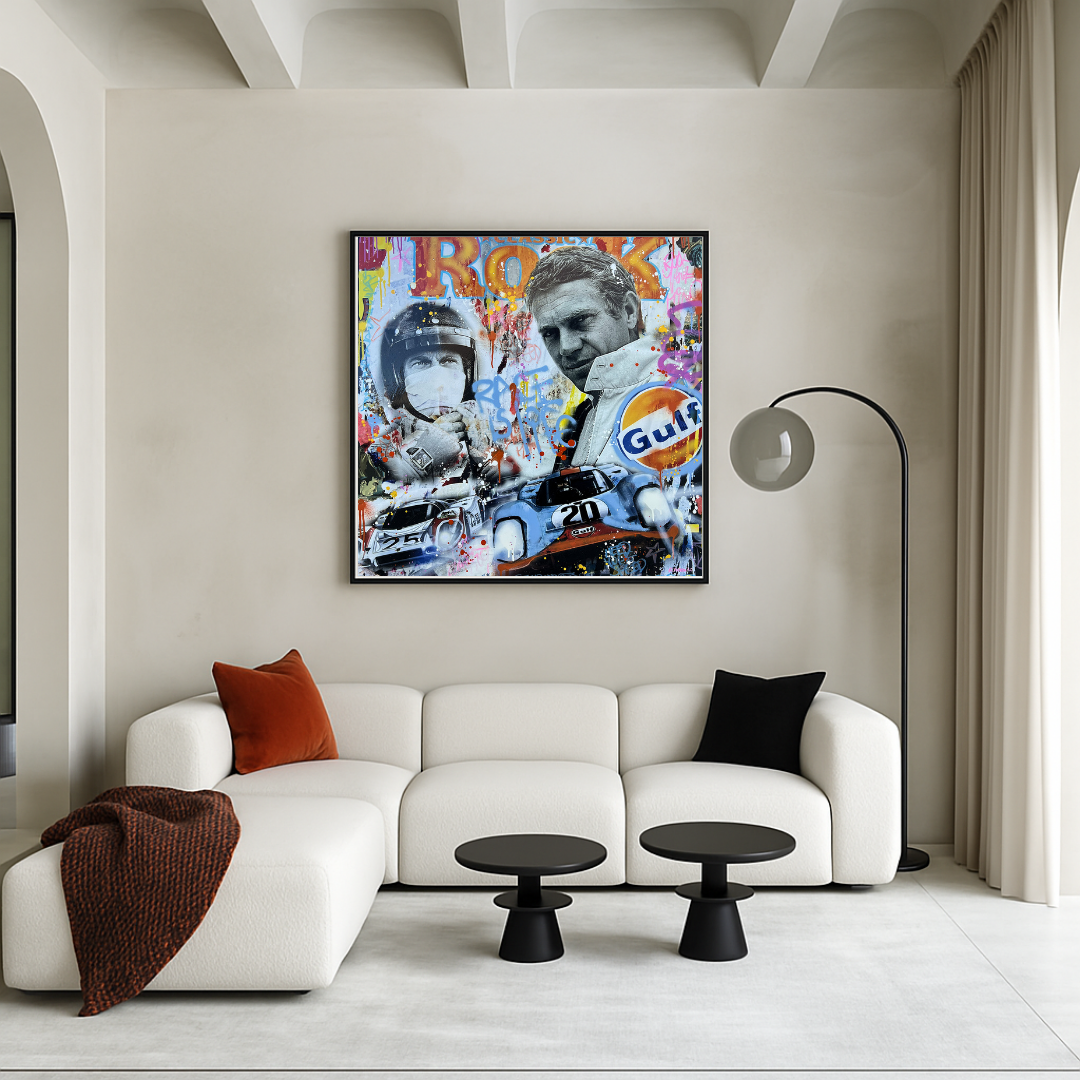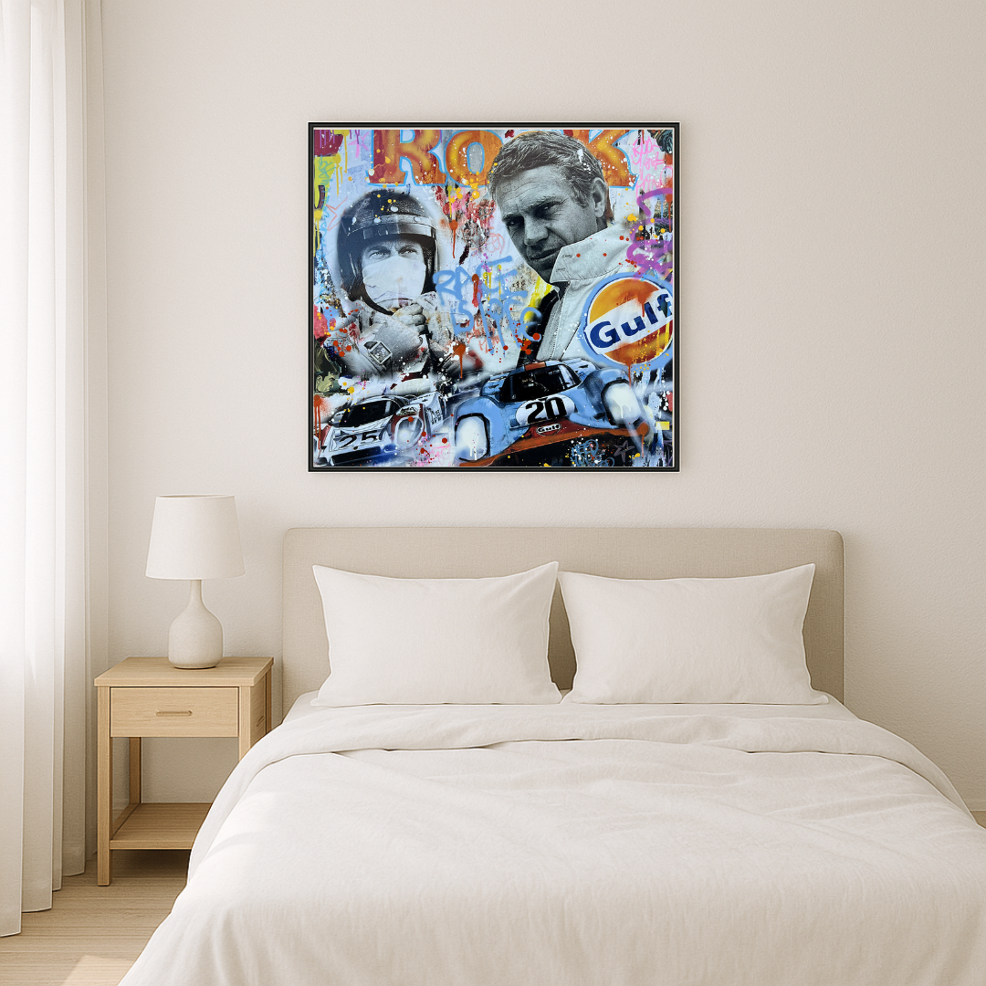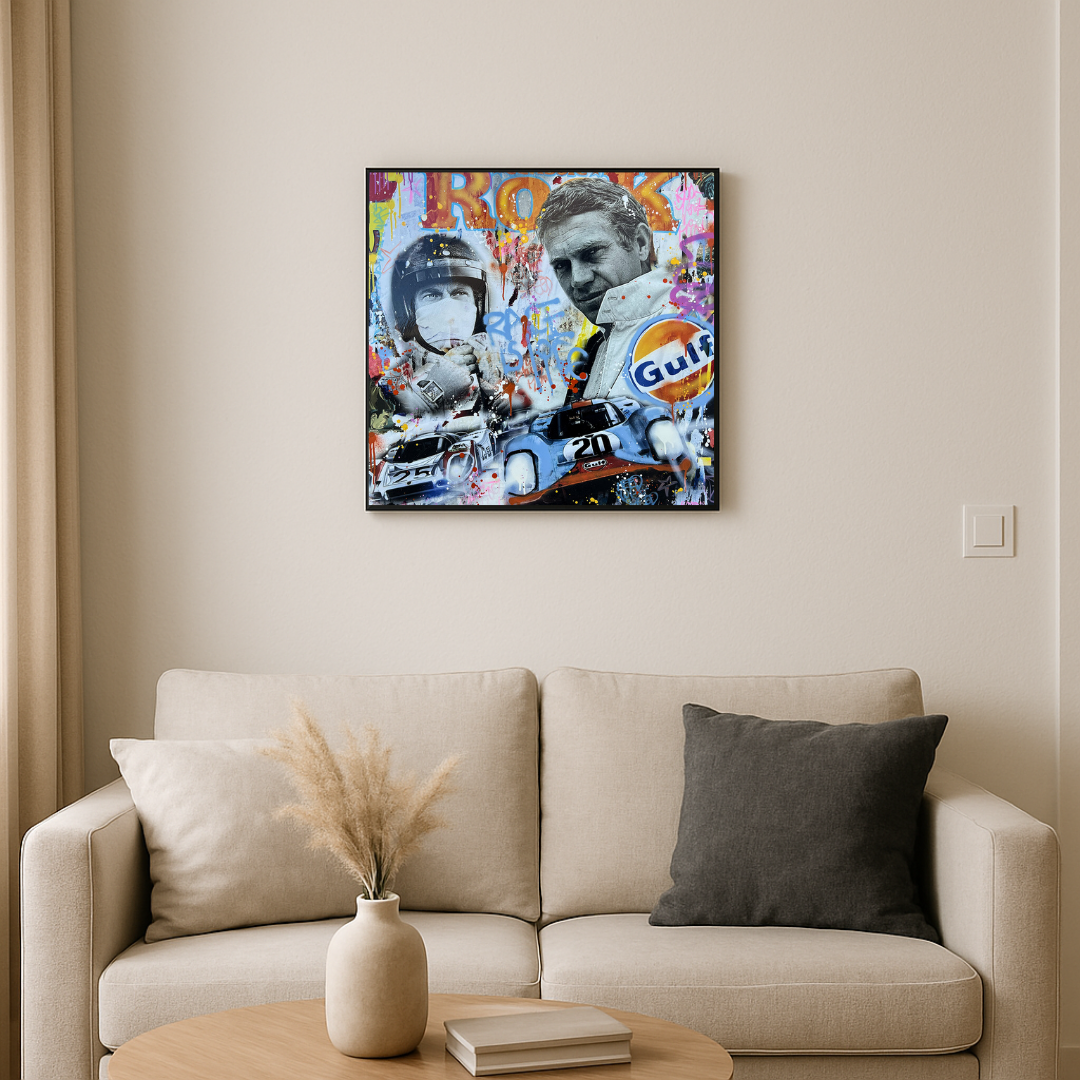 En format 100 × 100 cm, Steve 917 Racing s’adresse aux passionnés d’art urbain, de mécanique de légende et de culture cinématographique. Une œuvre puissante, entre pop art, Street culture et esprit de compétition.