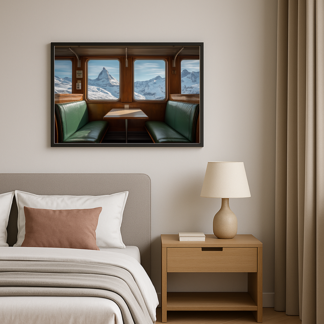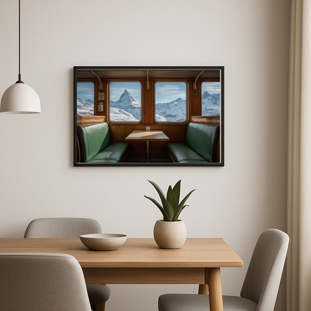 La composition transporte le spectateur dans un wagon classique, aux banquettes de cuir vert et aux boiseries chaleureuses. À travers les larges fenêtres, se déploie une vue saisissante du Cervin, montagne iconique de la Suisse, entourée de sommets enneigés. Ce cadrage soigneusement choisi invite à la contemplation et évoque l’expérience unique d’un voyage panoramique où nature et patrimoine se rencontrent. La scène allie le confort feutré de l’intérieur ferroviaire à l’immensité grandiose du paysage alpin, créant une atmosphère à la fois intime et universelle.