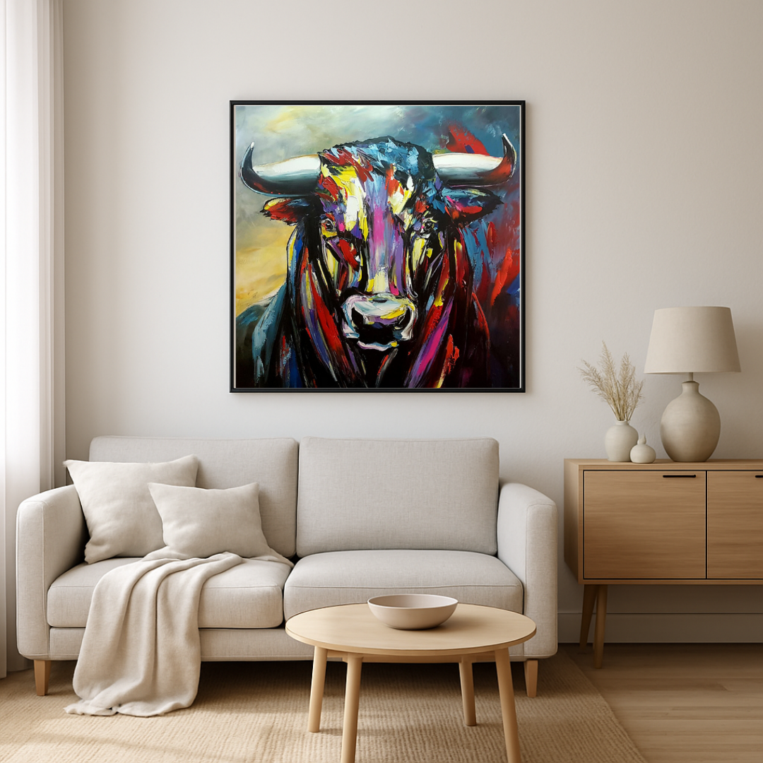 Majestueux et indomptable, ce taureau surgit de la toile avec toute la puissance de sa présence. Le travail au couteau donne à la matière une densité presque sculpturale, tandis que les couleurs flamboyantes — rouge carmin, bleu nuit, violet intense, jaune éclatant — accentuent la tension dramatique du sujet.