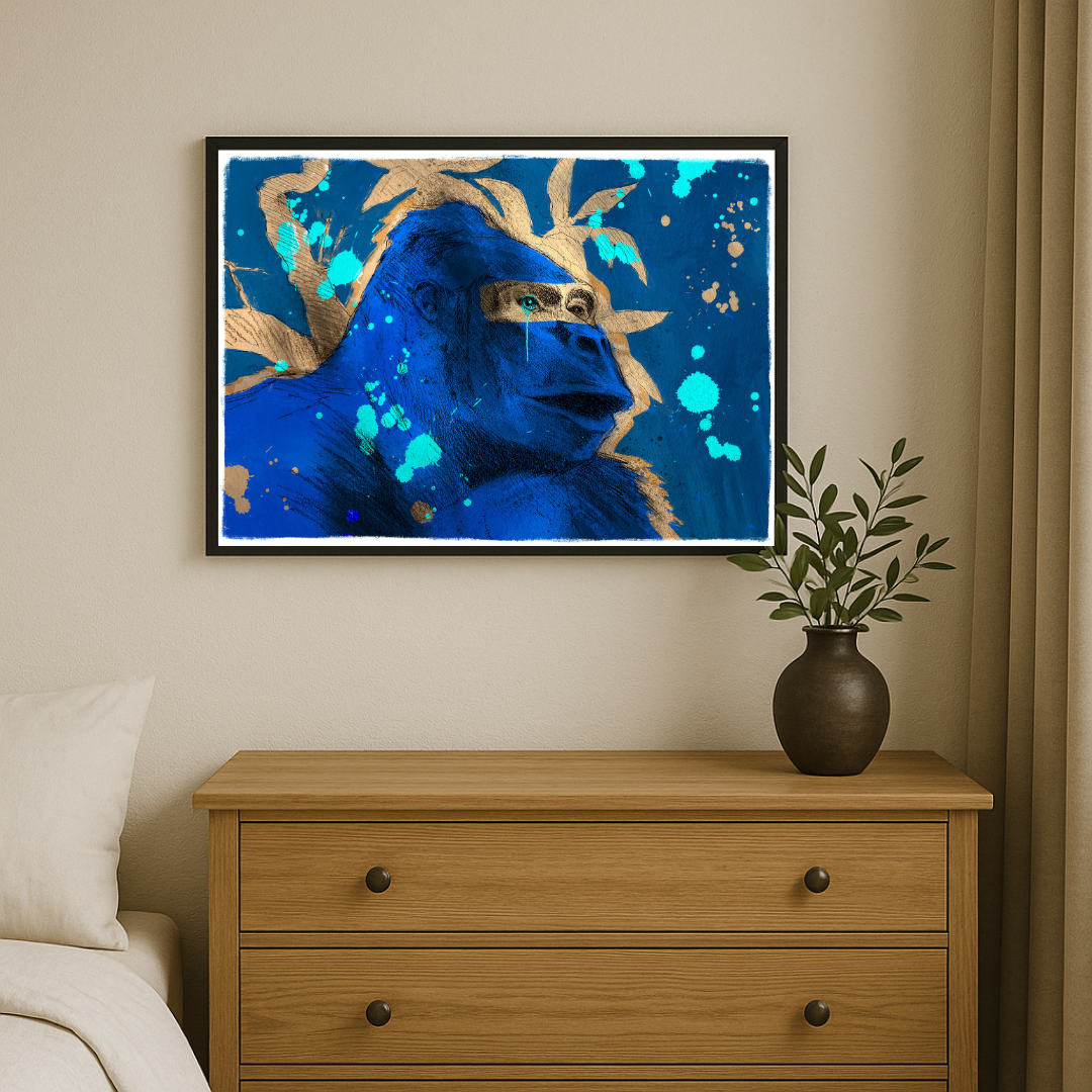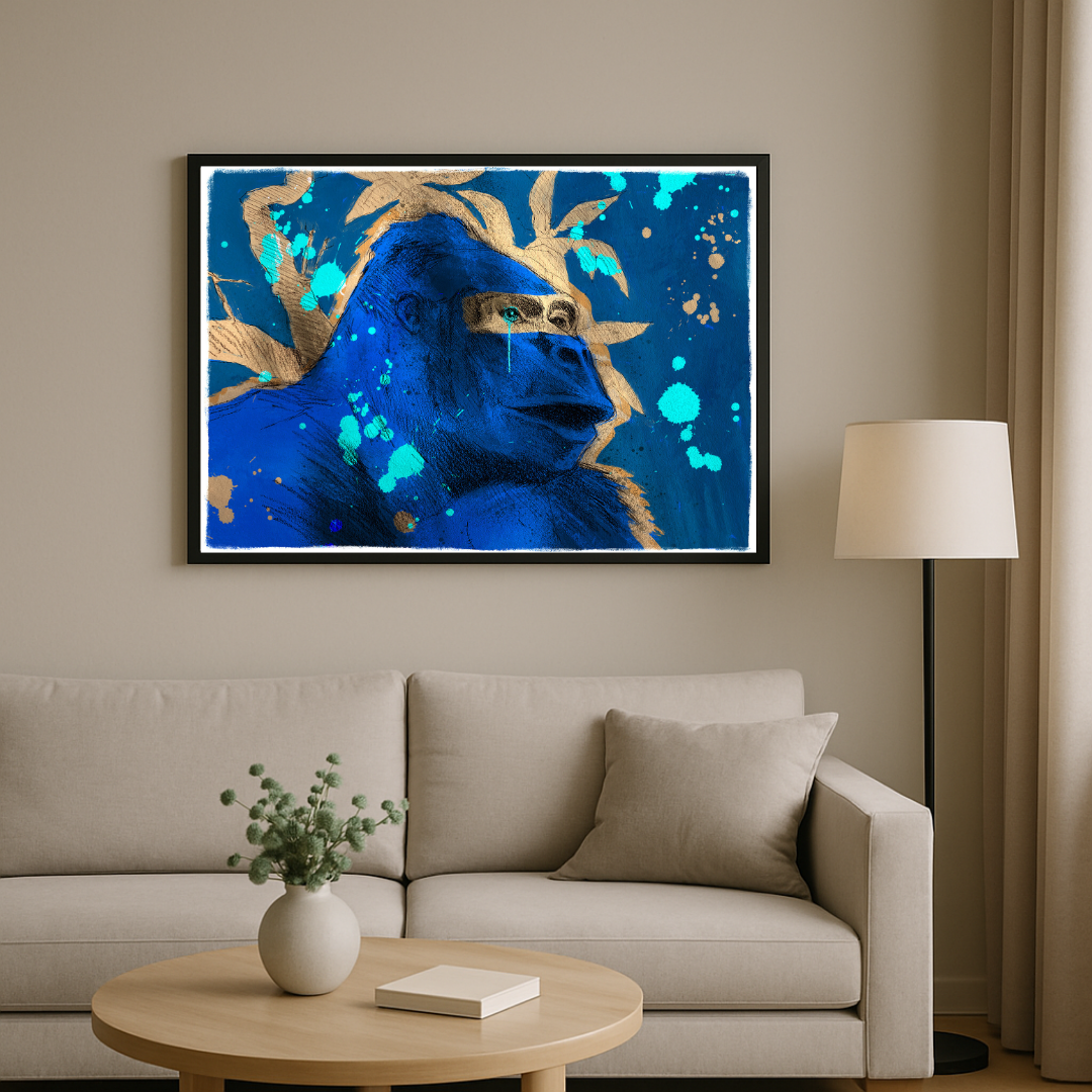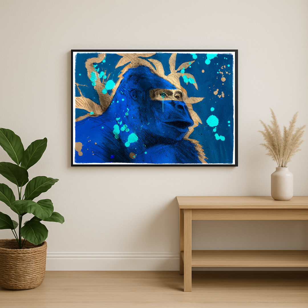 Le regard du gorille, central et bouleversant, capte immédiatement l’attention. Une larme bleue, fine et délicate, coule de son œil, symbole de fragilité dans un corps puissant. Cette dichotomie entre force et vulnérabilité interpelle le spectateur : cri silencieux face à la disparition du monde sauvage, reflet d’une humanité en quête de sens.