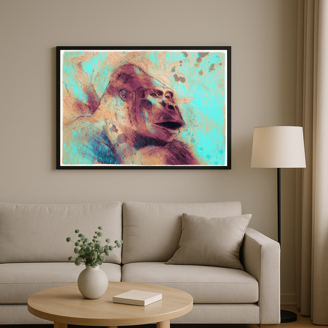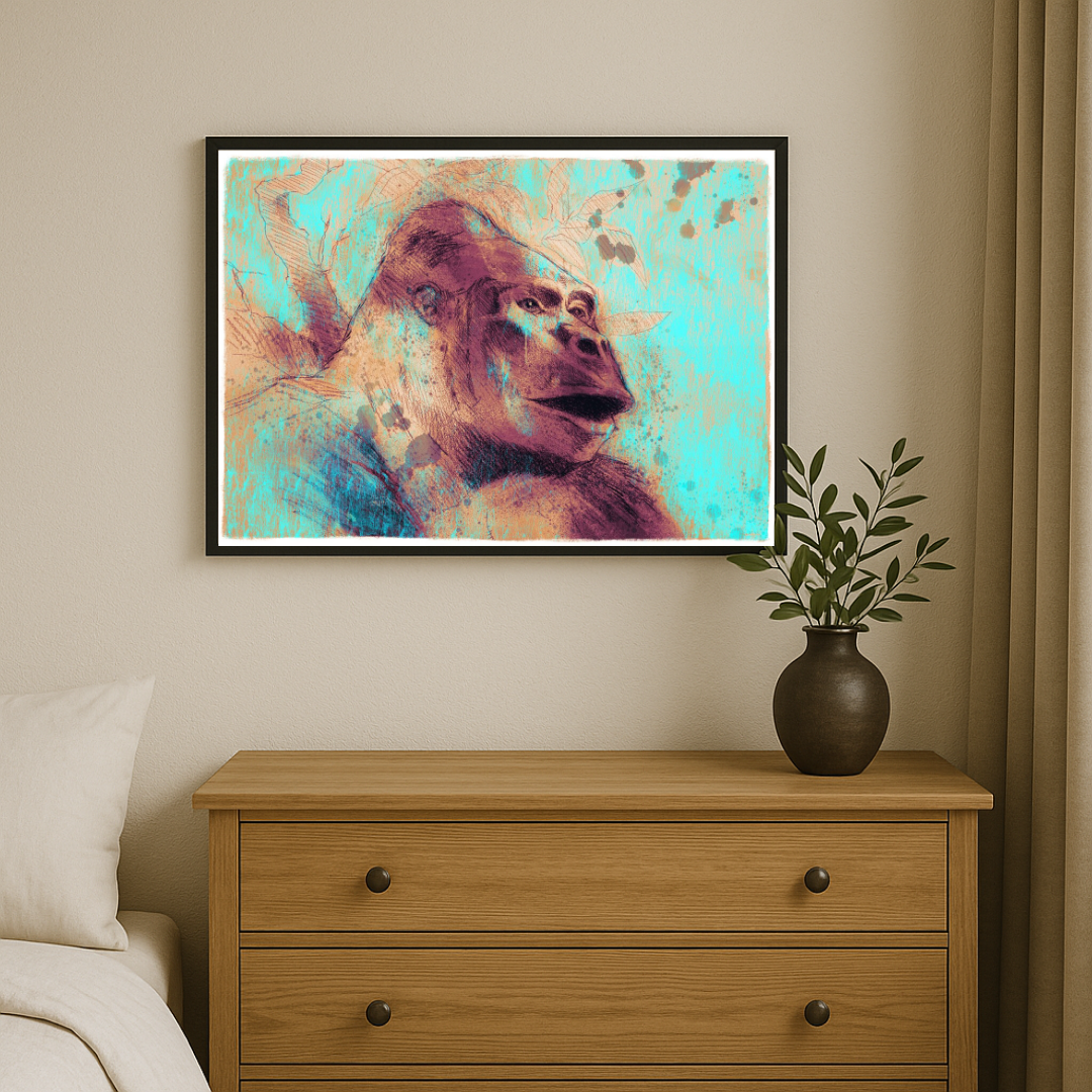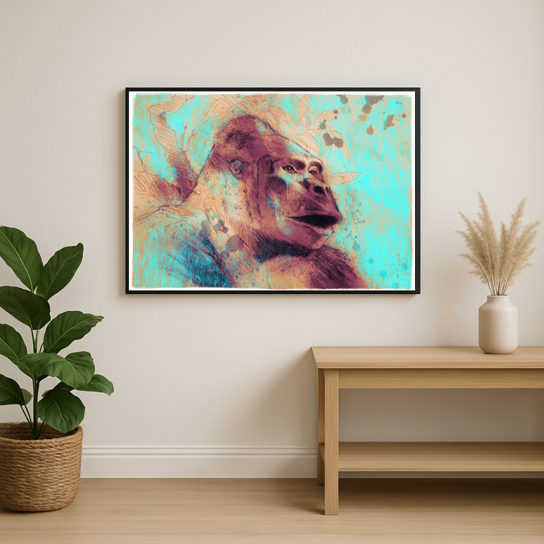 Mischtechnik auf Arches-Papier 56×76 cm. TEAR 3 zeigt einen Gorilla voller stiller Kraft und zurückhaltender Emotion. Türkis- und Ockertöne verleihen der Szene eine poetische Aura. Ohne Träne, doch mit tiefem Blick, erinnert das Werk an die Zerbrechlichkeit der Natur.