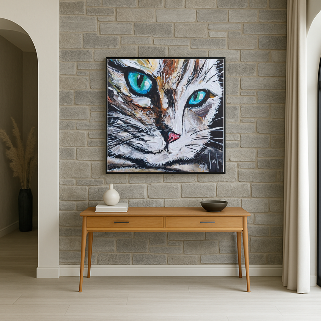 Plongé dans un face-à-face saisissant, le regard turquoise du félin hypnotise. La matière, posée au couteau avec énergie et précision, retranscrit avec intensité chaque vibration du pelage, chaque reflet de lumière dans les yeux. Les coups de lame dessinent les poils, sculptent les contours et font surgir la vie dans cette expression féline à la fois douce, farouche et curieuse.