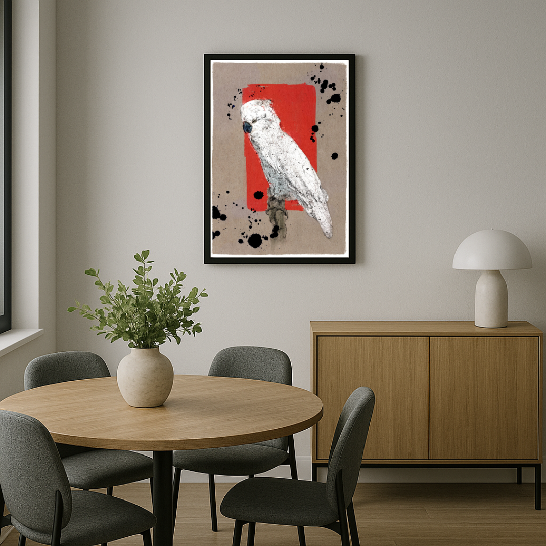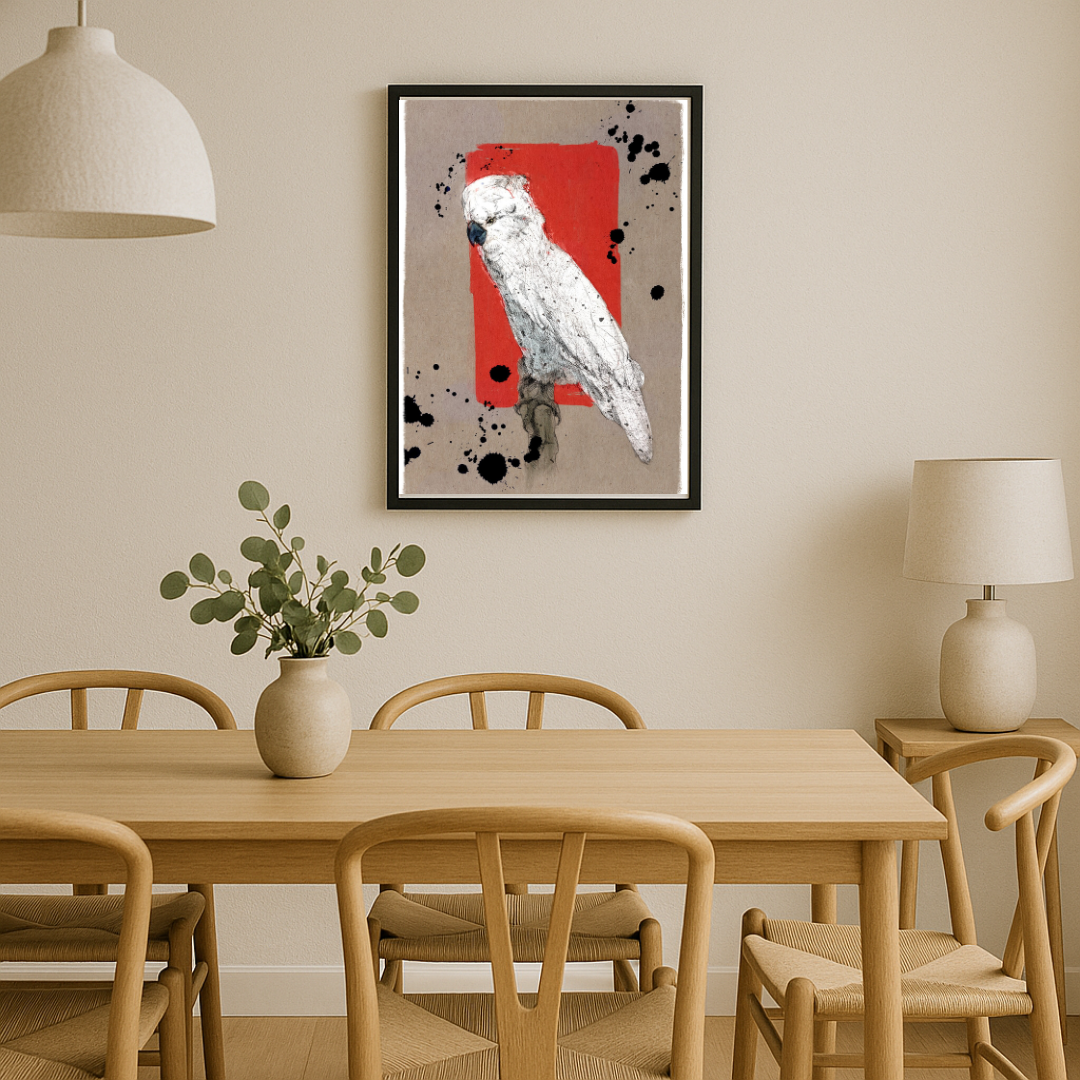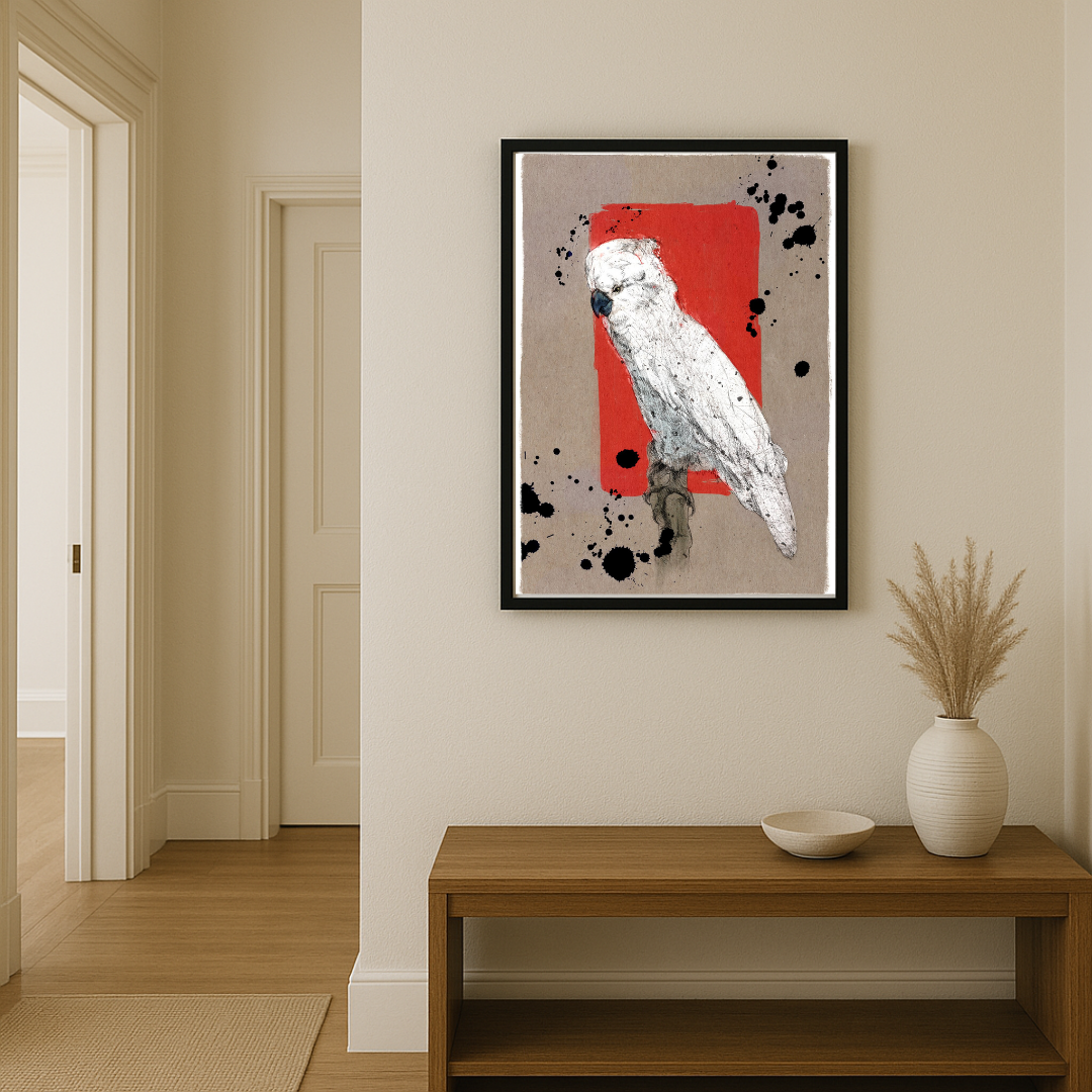 The Crown 3 portrays a white cockatoo sketched with finesse, set against a vivid red backdrop. Blending charcoal, pastels, graphite and digital texture, the piece contrasts purity with raw energy. Minimal yet striking, the bird wears an invisible crown – one of quiet elegance.