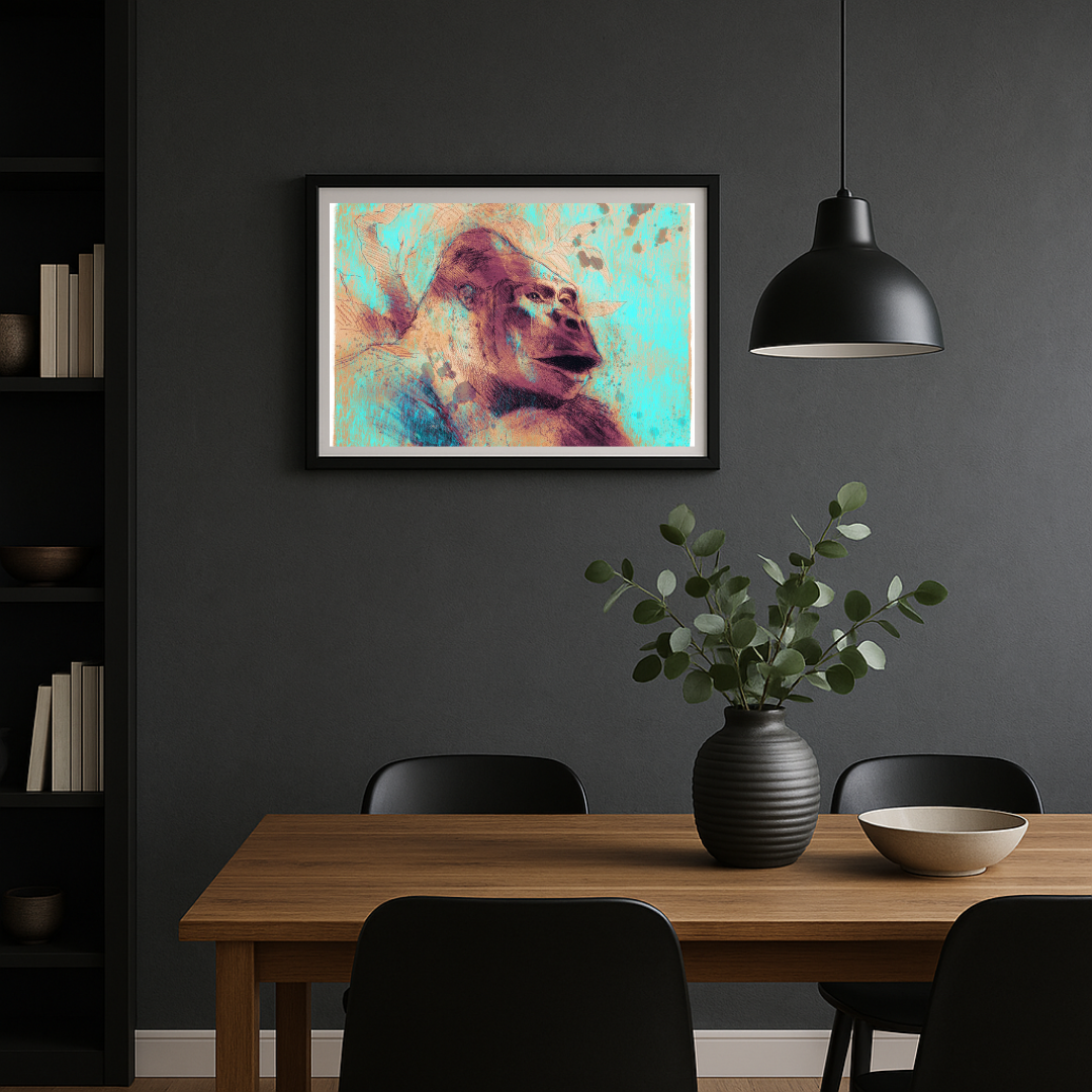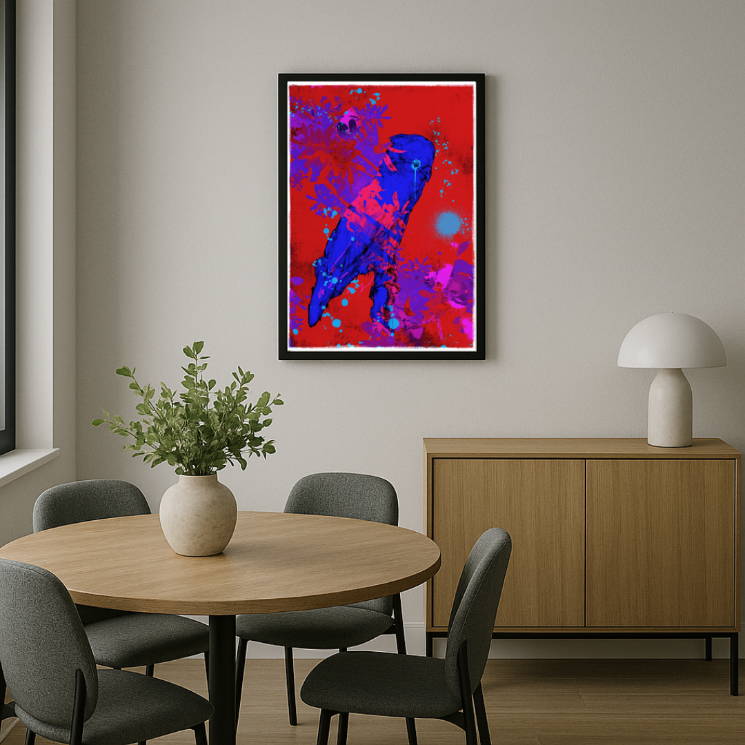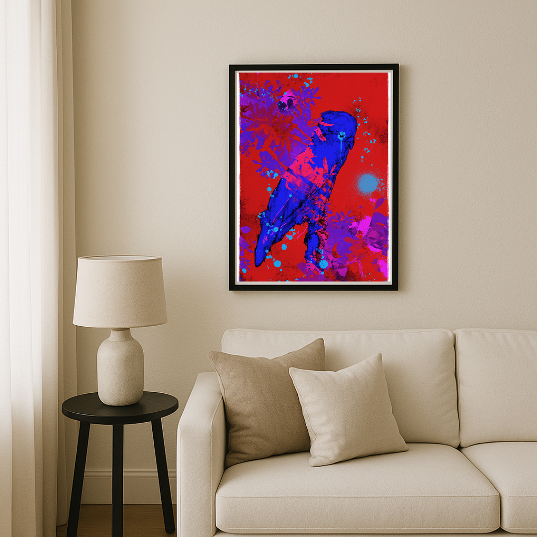 The Crown 63 Small features a bird in vivid blue and fuchsia against a deep red backdrop. Combining charcoal, graphite, pastels and digital textures, the artwork suggests an emotional crown – fragile, noble, marked by a turquoise tear. A poetic fusion of wildness and modernity.