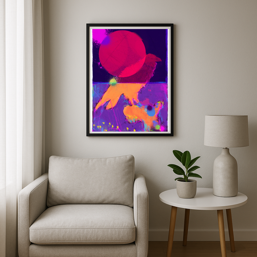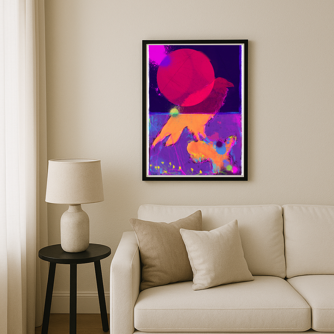 Dans The Dream Keeper, Antoine Savolainen plonge le spectateur dans un univers onirique, vibrant de couleurs et de symboles. La silhouette d’un corbeau, gardien des rêves et messager des mondes invisibles, se détache devant un immense astre rouge incandescent, semblable à un soleil brûlant ou une planète intérieure.