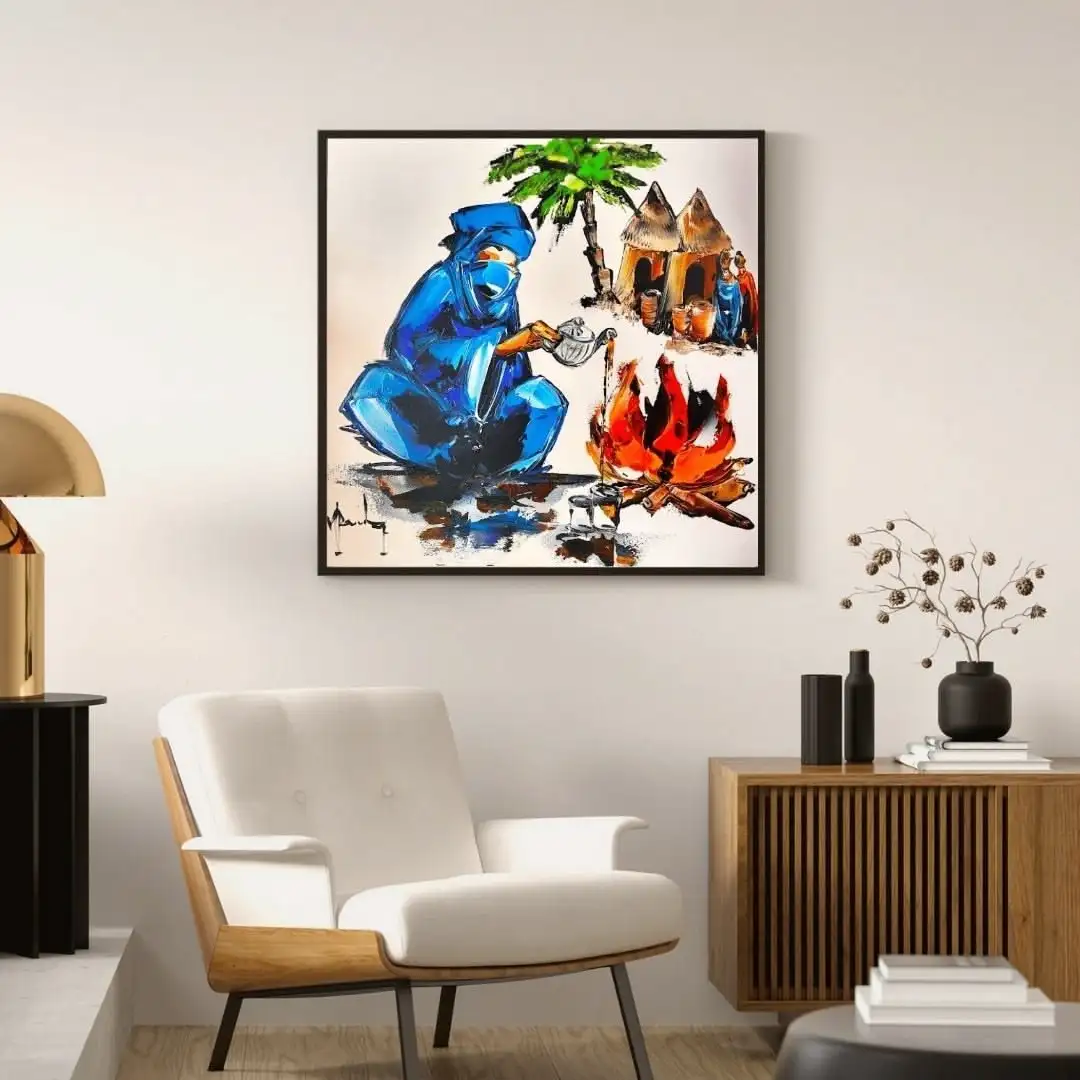 Avec Touareg, Christof Monnin nous transporte au cœur du désert, dans une scène de vie empreinte de chaleur et de tradition. Réalisée à l’acrylique au couteau, cette œuvre se distingue par son intensité chromatique, ses textures vives et la force de son geste pictural. Le bleu profond du personnage central, figure emblématique du peuple touareg, contraste magnifiquement avec les flammes rougeoyantes du feu et la lumière ocre des habitations traditionnelles.