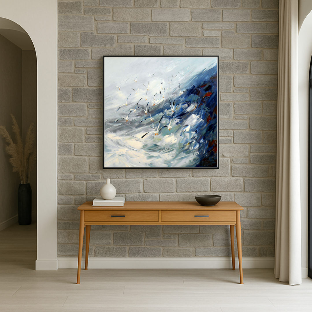 « Vagues et mouettes » est une œuvre réalisée à l’huile, livrée avec un certificat d’authenticité signé par l’artiste.