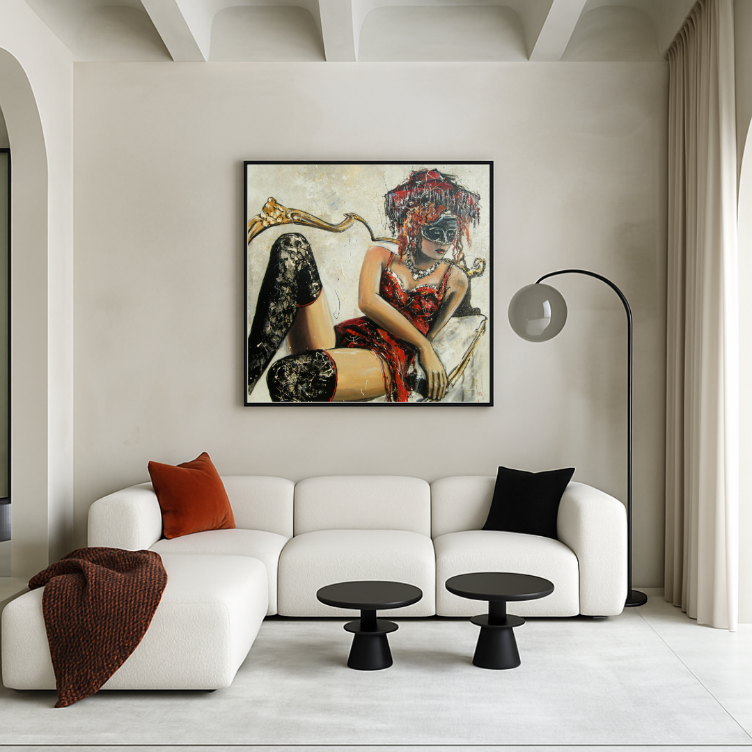 Cette toile sensuelle et théâtrale met en scène une femme masquée, drapée de rouge et de mystère. Allongée sur un fauteuil baroque, elle évoque les fastes de Venise, entre érotisme assumé et raffinement ancien. La texture riche et nerveuse du couteau donne vie aux détails : dentelle, perles, tissus froissés, et éclats de lumière.