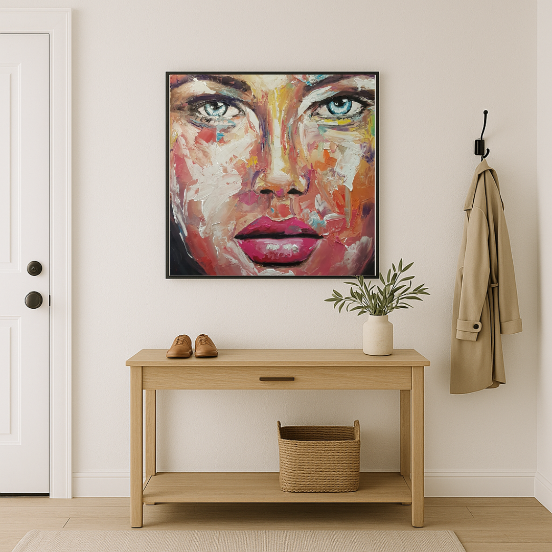 Ici, le visage féminin émerge dans un tourbillon de matière et de couleurs. Le regard bleu perçant contraste avec la richesse chromatique de la peau, construite par couches successives de rose, blanc, orange, ocre et éclats turquoise. La technique au couteau donne à l’ensemble une texture puissante, une vibration presque palpable.