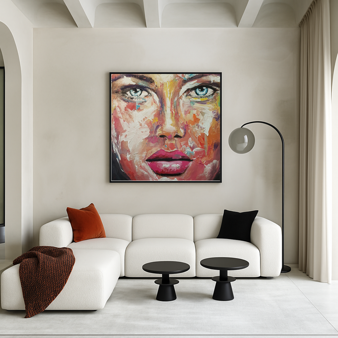 Ce portrait saisissant, signé Céline Lust, est une œuvre réalisée à l’acrylique au couteau sur toile, au format 100 × 100 cm. Chaque pièce est livrée avec un certificat d’authenticité signé par l’artiste, sous un délai d’environ 3 semaines.