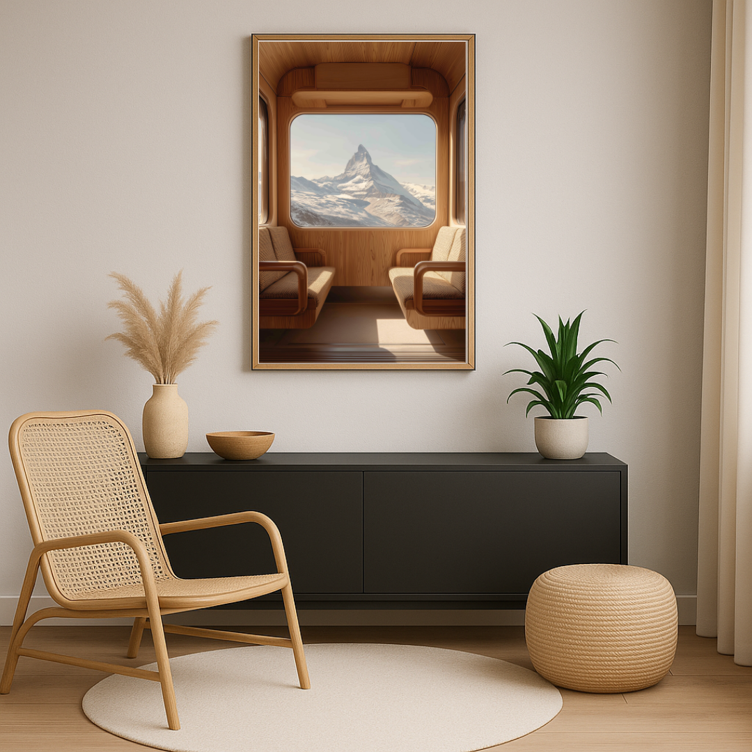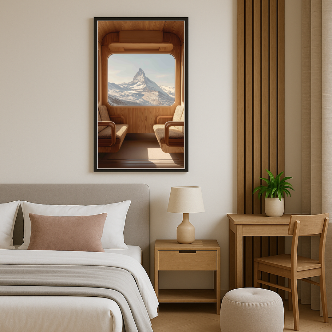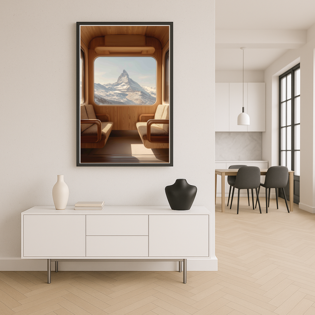 La composition plonge le spectateur à l’intérieur d’un wagon aux finitions boisées et chaleureuses, où deux banquettes se font face. Au centre, la grande fenêtre s’ouvre sur une vue grandiose du Cervin, montagne mythique des Alpes suisses, baignée de lumière hivernale. Cet équilibre entre intérieur confortable et immensité extérieure crée un contraste saisissant : la douceur rassurante de la cabine face à la puissance immuable de la nature. Le cadrage précis invite le spectateur à devenir voyageur, à s’asseoir et à contempler le paysage dans un instant suspendu.